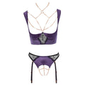 A beautiful mixture of materials and removable rhinestone chains! Longline shelf bra with crotchless briefs, with suspender straps, from Abierta Fina made out of stretchy, purple satin with delicate black lace inserts and decorated with rose-gold coloured chains with rhinestones. The underwired shelf bra and slightly padded cups emphasizes the breasts in a beautiful way and make them extremely eye-catching. The chains and choker can be removed from the shelf bra. The wide bra straps turn into double straps at the back and are adjustable. The suspender briefs are made out of a mixture of material at the front and the back of the briefs are made entirely out of lace. There are three stimulating chains over the seductive open crotch area. The chains and suspender straps are removable. The suspender straps are also adjustable. 90% polyamide, 10% spandex. Without stockings.