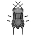 Basque and string with 4 restraints. Powernet with matte look strap details. Removable hook and loop restraints with snap hook chains. Adjustable cleavage straps, straps and suspender straps. A sensational bondage look with 4 hand, arm restraints! Basque and string from Cottelli BONDAGE made out of stretchy powernet with strap details in a bondage look. The details are made out of beautiful matte look material and there are also silver-coloured metal elements on the basque. The 4 elaborate handarm restraints with adjustable hook and loop fasteners make hot bondage sessions possible and they can be attached to the rings at the sides thanks to the 4 snap hook chains. The straps in the cleavage area, the straps of the basque and the suspender straps can be adjusted for a perfect fit. There are also hook fasteners at the back of the basque and press studs on the halterneck. 90% nylon, 10% spandex. Stockings not included.