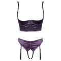 Quarter cup bra and crotchless suspender thong in a set from Cottelli LINGERIE. Made from dark purple stretch satin in a classy gathered look with black details. The longer-cut, underwired bra with lightly padded cups puts the bust in the spotlight and creates an irresistible eye-catcher. The straps and the hook fastening in the back are adjustable to fit. The suspender thong seduces with a completely open crotch. The suspenders are adjustable and can also be removed completely. Quarter cup bra and crotchless suspender thong in a set Purple stretch satin with black details Elegant gathered look Crotchless design Removable suspenders Adjustable straps and suspenders Soft and stretchy for high comfort Opulent, gathered look in an elegant colour! 90% polyamide, 10% spandex. Stockings not included.