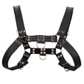 This handsome harness combines bonded leather and stainless-steel detail, to wrap around your chest and back, accentuating your curves and edges. The two O-rings, one on the front and the back, make it easy to attach various BDSM accessories and take your bondage play to the next level. Buckles on the sides of the torso and on each shoulder allow you to adjust this harness to the perfect fit. Wear it on bare skin and instantly capture admiring eyes as they showcase your strength. Wear it over your clothes and let people know what kind of fun youre up for!