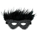 Black satin look mask with lace overlay. Black feathers adorn the crown. Elastic strap back for comfort.