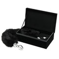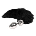 Small smooth stainless steel anal plug with a long black bushy faux tail, all in a black presentation box. The butt plug is 3.5 inches long, 2.5 of which is insertable. The tail measures 12 inches in length.