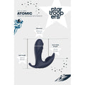 Reach for the stars with the Atomic prostate massager from the Startroopers collection. The triple stimulation plus 7 vibrations and 3 speeds will stimulate the P-spot and give you superb anal sensations. For ease of use, Atomic comes with a remote control to cycle through the 7 vibration rhythms and 3 speeds. Operation on the vibrator is also possible. The Atomic prostate massager that is made of ABS and smooth, soft silicone is free of phthalates and safe for the body. With its IPX6 rating for water resistance, its easy to clean too. The toy has a waterproof charging hole and a USB pin charging cable is included. The remote is not waterproof. It includes a CR2032 battery. Atomic is ready for 60 minutes of stimulation after a full charge. Prostate massager with wireless remote Triple stimulation 1 Motor 10 Vibrations 5 rhythms, 5 speeds Single-button operation on the massager 2 Button operation with remote Rechargeable, USB pin cable included Charging time 90 minutes Run time 60 minutes IPX6 water resistance massager The Remote contains a CR2032 battery, not waterproof Made of silicone and ABS Body-safe, phthalate-free